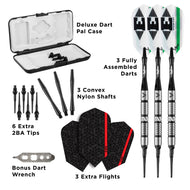 - Incluye seis vuelos, tres ejes de repuesto de nailon adicionales, nueve puntas 2BA Tufflex II, una herramienta de reparación mecánica de dardos, tres protectores de vuelos y un estuche Deluxe Dart Pal