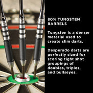 EspañolDesata el forajido que llevas dentro cuando vayas a disparar con los dardos con punta de acero Viper Desperado, diseñados para su uso con dianas de sisal. Estos dardos están repletos de características, empezando por el cañón, fabricado con un 80 % de tungsteno y un 20 % de níquel. El tungsteno es un metal muy denso, capaz de crear dardos más finos con el mismo peso que los metales más ligeros; esto permite agrupaciones de tiros más ajustadas sin sacrificar el control, lo que aumenta tus puntuaciones. El tungsteno también es un signo de calidad y durabilidad debido a su densidad. Un mayor contenido de tungsteno producirá un perfil de dardo más fino que uno con menos. Más tungsteno en el dardo aumenta el precio, ya que el tungsteno es un metal raro y su densidad requiere más esfuerzo para mecanizarlo. El aumento de precio proporciona un cañón de mayor calidad y puede mejorar el rendimiento, lo que aumenta las puntuaciones. Cada cañón cuenta con bandas moleteadas y ranuras profundas, lo que permite que tu agarre se mantenga constante lanzamiento tras lanzamiento. Los dardos Desperado cuentan con varillas de aluminio resistentes y ligeras. Estas varillas cuentan con orificios de bloqueo que permiten un ajuste más seguro a tu cañón; No tendrás que volver a apretar las varillas después de uno o dos tiros. Por último, cada dardo está rematado con gráficos clásicos de degolladores que adornan cada cola de abanico, para una apariencia aterradora. Cada juego incluye seis plumas, seis varillas de nailon Viperlock Shade de repuesto, una herramienta de reparación de dardos y un estuche de EVA TacTech para dardos. El estuche de dardos TacTech es un excelente estuche todo en uno para tus nuevos dardos. Con una carcasa exterior dura y ranuras forradas de espuma para mantener tus dardos seguros, ¡este estuche tiene espacio para todo lo incluido en este juego!