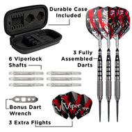 - Incluye: tres dardos con punta de acero completamente ensamblados, 6 ejes de dardos Viperlock de repuesto, 3 plumas adicionales y una llave para dardos, todo ello empaquetado en el estuche de dardos TacTech incluido.