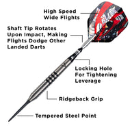 - Varillas de dardos Spinster: cada dardo cuenta con varillas de dardos Spinster de aluminio resistentes que giran para reducir las desviaciones y orificios de bloqueo para mantenerlas firmemente aseguradas al cañón.