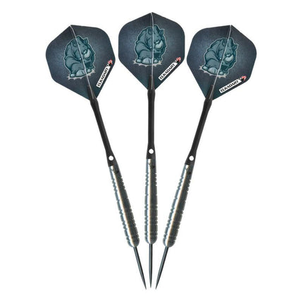 Domina la competencia con los dardos Elkadart Rhino de punta de acero, diseñados para dianas de sisal. Estos dardos incorporan numerosas características, empezando por su barril, fabricado con un 80 % de tungsteno y un 20 % de níquel. El tungsteno es un metal muy denso, lo que permite crear dardos más finos con el mismo peso que los de metales más ligeros; esto facilita agrupaciones de tiros más precisas sin sacrificar el control, aumentando así tus puntuaciones. Gracias a su densidad, el tungsteno es sinónimo de calidad y durabilidad. Un mayor contenido de tungsteno produce un perfil de dardo más fino, y el 80 % es uno de los porcentajes más altos que encontrarás en un juego de dardos. Un mayor contenido de tungsteno en el dardo aumenta el precio, ya que es un metal escaso y su alta densidad requiere un mayor esfuerzo para su mecanizado. Este mayor precio se traduce en un barril de mayor calidad y un mejor rendimiento, aumentando así tus puntuaciones. Estos dardos son robustos, con un peso adicional en todos los estilos de barril. Cada barril cuenta con bandas moleteadas y ranuras profundas, lo que permite un agarre constante lanzamiento tras lanzamiento. Los dardos Rhino cuentan con resistentes cañas de nailon que distribuyen adecuadamente su peso para una trayectoria de vuelo óptima. Además, cada dardo luce un imponente diseño de rinoceronte en cada pluma de planeo ancho, para una apariencia amenazante. Cada juego incluye tres plumas de planeo ancho. Fabricados en Inglaterra.