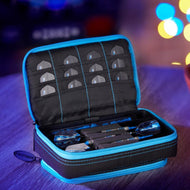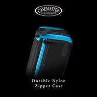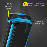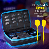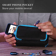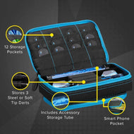 Estuche para dardos Casemaster Plazma Plus en color negro con detalles en azul y bolsillo para teléfono