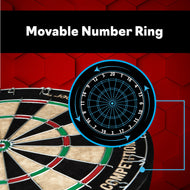 - Anillo numérico giratorio : el anillo numérico desmontable le permite girar el tablero, lo que permite que las fibras de sisal se curen y prolonguen la vida útil del tablero de dardos.