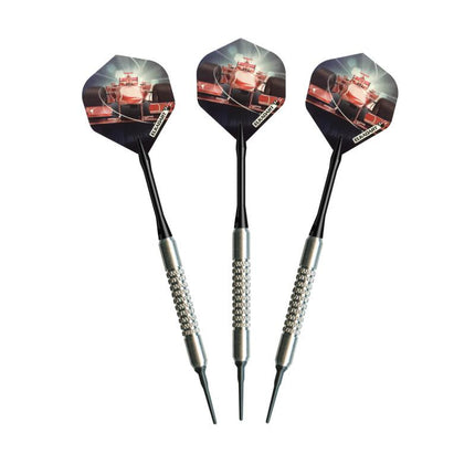 Take your game into overdrive when you bring the Elkadart Turbo Soft Tip Darts, designed for use with either electronic dart boards or most sisal dart boards. These darts are packed with features starting with the barrel, fashioned from electroplated tin alloy. Constructing the darts in this fashion allows us to bring you tough, weighted barrels without breaking the bank. Used in construction for its high end appearance and durability at a lower cost, we use this alloy to provide the highest quality barrels at the best cost to you. Each barrel possesses knurled bands and rings, allowing your grip to remain precise throw after throw. The Turbo Darts feature tough, lightweight aluminum shafts. These shafts feature locking holes that allow a more secure fit to your barrel; you won’t find yourself retightening these shafts after a shot or two. Each included shaft is a signature hyperspeed amethyst color. Finally, each dart is finished off with stunning neon turbo designs adorning each flight, for an lightspeed look on each dart. Each set includes three flights, three shafts, and three 2BA Tufflex II Tips.