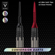 • Conversion darts come with a set of converter steel tips, and soft tips, making them usable with both sisal and electronic dartboards
