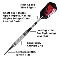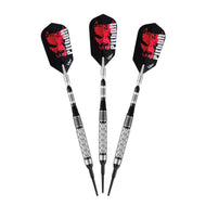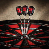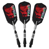 Bring a primal ferocity to your dart game with the Viper Pitbull Soft Tip Darts, designed for use with either electronic dart boards or most sisal dart boards. These darts are packed with features starting with the barrel, fashioned from 90% Tungsten and 10% Nickel. Tungsten is a very dense metal, able to create slimmer darts with the same weight as lighter metals; this allows for tighter shot groupings without sacrificing control, increasing your scores. Tungsten is a sign of quality and durability as well because of its density. A higher tungsten content will produce a slimmer dart profile than one with less and 90% is among the highest you’ll find in dart set. More tungsten in the dart increases the price as tungsten is a rare metal and its density takes more effort to machine. The increased price gives a higher quality barrel and can improve performance, increasing scores. Each barrel enjoys knurled bands, deep grooves and hand painted rings, allowing your grip to remain consistent throw after throw. The Pitbull Darts feature tough, lightweight Aluminum Spinster Shafts that can rotate freely, allowing them to make way for your next shots reducing bounce outs. These shafts feature locking holes that allow a more secure fit to your barrel; you won’t find yourself retightening these shafts after a shot or two. Finally, each dart is finished off with a savage Pitbull adorning each slim flight, for a fierce look. Each set includes six high speed slim flights, twelve extra 2BA Tufflex III Tips, a dart mechanic repair tool, and a TacTech EVA dart case. The TacTech dart case is a great all-in-one case for your new darts. Featuring a hard outer shell and foam lined slots to keep your dart secure, this case has room for everything included in this set!