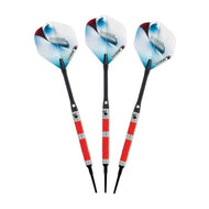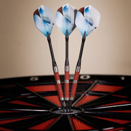 Cut to the chase and slice your opponents in twain when you bring the Elkadart Razor Soft Tip Darts, designed for use with either electronic dart boards or most sisal dart boards. These darts are packed with features starting with the barrel, fashioned from 80% Tungsten and 20% Nickel. Tungsten is a very dense metal, able to create slimmer darts with the same weight as lighter metals; this allows for tighter shot groupings without sacrificing control, increasing your scores. Tungsten is a sign of quality and durability as well because of its density. A higher tungsten content will produce a slimmer dart profile than one with less and 80% is among the highest you’ll find in dart set. More tungsten in the dart increases the price as tungsten is a rare metal and its density takes more effort to machine. The increased price gives a higher quality barrel and can improve performance, increasing scores. Each barrel possesses ridgeback grooves with a black oxide coating allowing your grip to remain precise throw after throw. The Razor Darts feature tough, lightweight aluminum shafts. These shafts feature locking holes that allow a more secure fit to your barrel; you won’t find yourself retightening these shafts after a shot or two. Finally, each dart is finished off with the slicing razor graphic adorning each flight, for a sharp look on each dart. Each set includes three flights, three shafts, and three 2BA Tufflex II Tips.