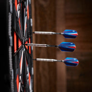 Coil up and prepare to strike with the Viper Sidewinder Soft Tip Darts, designed for use with either electronic dart boards or most sisal dart boards. These darts are packed with features starting with the barrel, fashioned from 80% Tungsten and 20% Nickel. Tungsten is a very dense metal, able to create slimmer darts with the same weight as lighter metals; this allows for tighter shot groupings without sacrificing control, increasing your scores. Tungsten is a sign of quality and durability as well because of its density. A higher tungsten content will produce a slimmer dart profile than one with less. More tungsten in the dart increases the price as tungsten is a rare metal and its density takes more effort to machine. The increased price gives a higher quality barrel and can improve performance, increasing scores. Each barrel enjoys knurled bands, deep grooves or shark fins, allowing your grip to remain consistent throw after throw. The Sidewinder Darts feature tough, lightweight Aluminum Shafts, for maximum durability. These shafts feature locking holes that allow a more secure fit to your barrel; you won’t find yourself retightening these shafts after a shot or two. Finally, each dart is finished off with wild sidewinder graphics adorning each slim flight, for a dangerous look. Each set includes six high speed slim flights, three extra nylon shafts, six 2BA Tufflex II Tips, and dart mechanic repair tool. Barrels also feature a limited lifetime warranty!