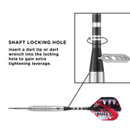 Bring up your level of competition with the Viper Bully Steel Tip Darts designed for use with sisal dart boards. These darts are packed with features starting with the barrel, fashioned from 80% Tungsten and 20% Nickel. Tungsten is a very dense metal, able to create slimmer darts with the same weight as lighter metals; this allows for tighter shot groupings without sacrificing control, increasing your scores. Tungsten is a sign of quality and durability as well because of its density. A higher tungsten content will produce a slimmer dart profile than one with less. More tungsten in the dart increases the price as tungsten is a rare metal and its density takes more effort to machine. The increased price gives a higher quality barrel and can improve performance, increasing scores. Each barrel enjoys knurled bands, deep grooves and hand painted rings, allowing your grip to remain consistent throw after throw. The Bully Darts feature tough, lightweight Aluminum Color Master Shafts, with silver rings for a fierce look. These shafts feature locking holes that allow a more secure fit to your barrel; you won’t find yourself retightening these shafts after a shot or two. Finally, each dart is finished off with brutal splatter graphics adorning each slim flight, for a savage look. Each set includes six wide glide flights, three extra nylon shafts, dart mechanic repair tool, three flight protectors and a Deluxe Dart Pal Case. The Deluxe Dart Pal Case is a great all-in-one solution for your new darts. Featuring a hard out shell and cloth lined slots to keep your dart secure, the Deluxe Dart Pal has room for everything included in this set!