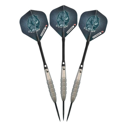 Charge ahead and trample over the competition when you bring the Elkadart Rhino Steel Tip Darts designed for use with sisal dart boards. These darts are packed with features starting with the barrel, fashioned from 80% Tungsten and 20% Nickel. Tungsten is a very dense metal, able to create slimmer darts with the same weight as lighter metals; this allows for tighter shot groupings without sacrificing control, increasing your scores. Tungsten is a sign of quality and durability as well because of its density. A higher tungsten content will produce a slimmer dart profile than one with less and 80% is among the highest you’ll find in dart set. More tungsten in the dart increases the price as tungsten is a rare metal and its density takes more effort to machine. The increased price gives a higher quality barrel and can improve performance, increasing scores. These darts are heavy duty, with extra weight across all barrel styles. Each barrel enjoys knurled bands and deep grooves, allowing your grip to remain consistent throw after throw. The Rhino Darts feature tough, Aluminum Shafts that properly distribute the massive weight of these darts for optimal flight trajectory. Finally, each dart is finished off with intimidating Rhino graphics adorning each wide glide flight, for a menacing look. Each set includes three wide glide flights. Made in England.