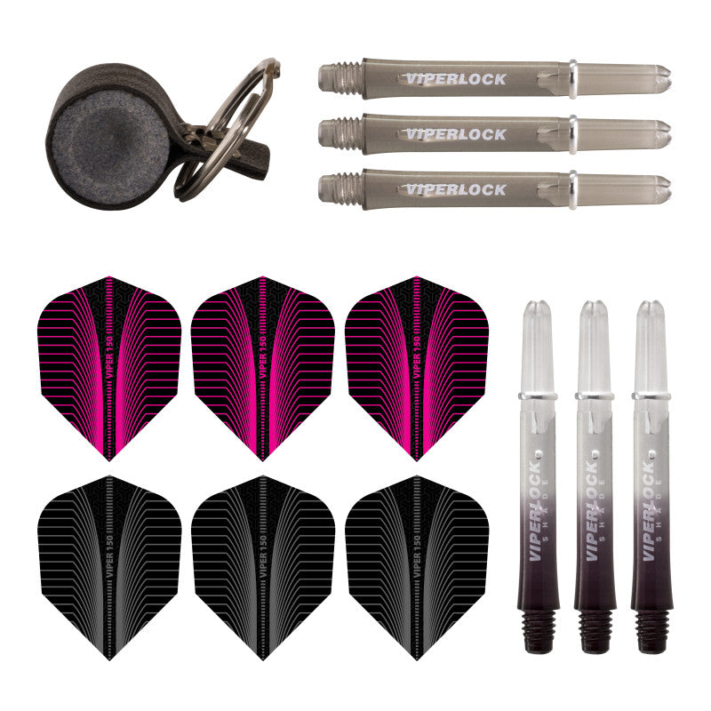 - Includes two sets of V-150 Standard dart flights, two sets of Viperlock dart shafts, and a key ring stone sharpener