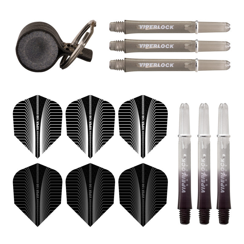 - Includes two sets of V-150 Standard dart flights, two sets of Viperlock dart shafts, and a key ring stone sharpener