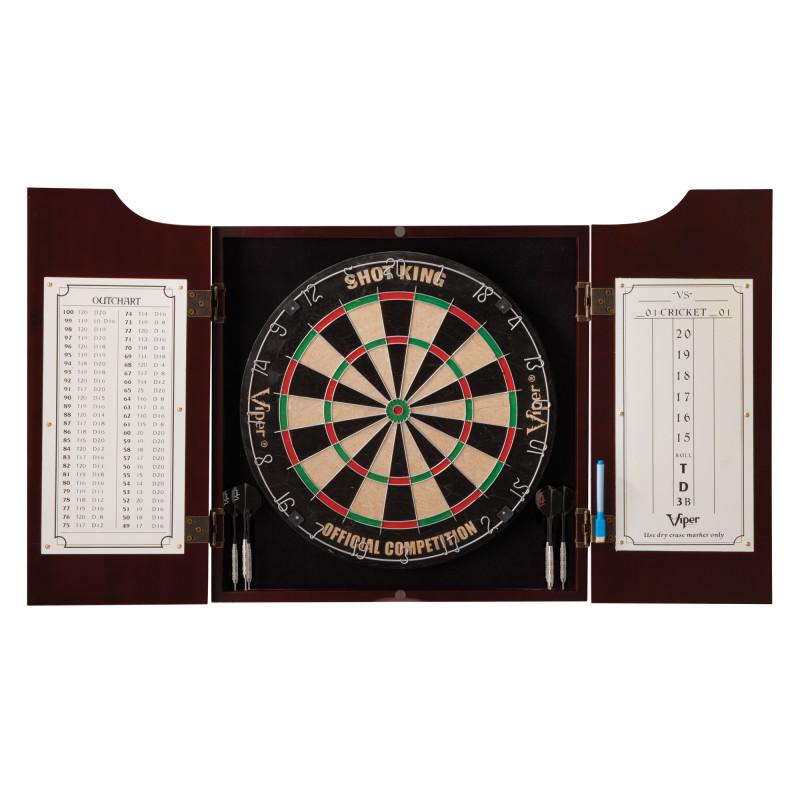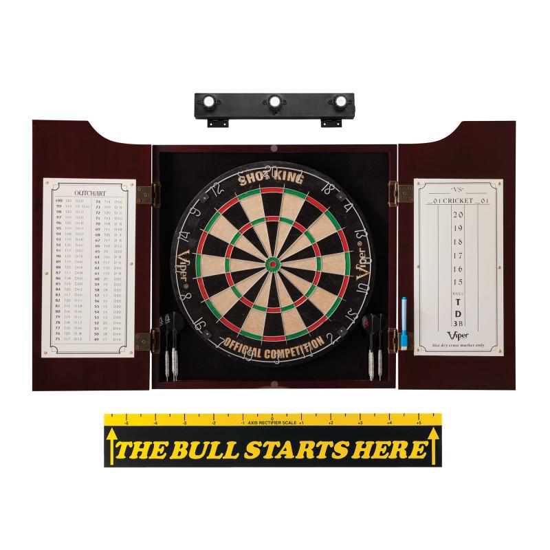 Go all in with the Viper Hudson All-in-One Dart Center, Throw Line Marker & Shadow Buster Dartboard Light Bundle! This comprehensive combo has everything you need to turn your game room into Darts Central! The bundle's Shot King dartboard is Tournament Quality Regulation 17.75" in diameter and made from compressed sisal fibers, granting it substantial longevity in comparison to older, wood-based boards. This is due to the material's "self-healing" nature: the sisal fibers automatically close the holes left behind by your darts, essentially returning the board to its original state whenever a dart is removed. You can also rotate the detachable number ring around the board, allowing your prime spots to move to a new section when the previous ones wear down. Its staple-free bullseye and rounded, galvanized steel wire spider also significantly decrease your odds of bouncing out upon impact, and if you want to get started right away, six starter darts are included to let you shoot first and ask questions later. Meanwhile, the Hudson Cabinet containing the board is constructed from pine and held together via box joints; its back is reinforced with thick cloth to protect your wall from punctures. The doors of the cabinet are fitted with self-closing brushed nickel hinges and feature built-in dry erase scoreboards. Extra darts can be stored in the slots built into the lower corners of the board area. The Shadow Buster illuminates your dartboard from above, making it - and all of your targets - visible in any rec room at any time. It also flips up when not in use and runs on four AA batteries. Rounding out the bundle is a standard throw line marker that's easily applied to any floor.