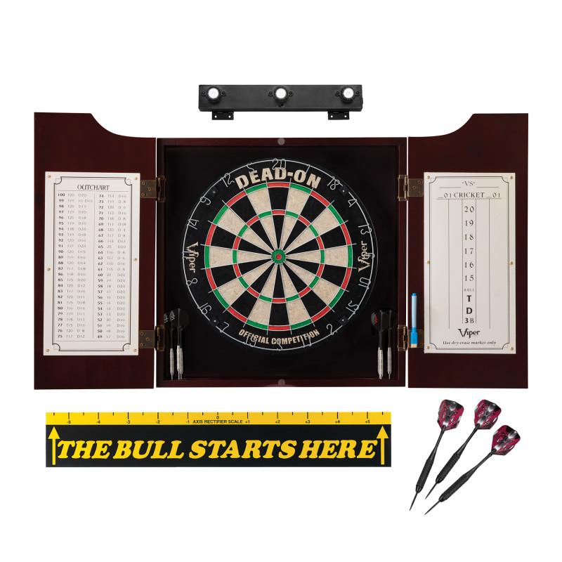 Viper Dead On Sisal Dartboard, Hudson Cabinet, Throw Line Marker, Black Mariah Steel Tip Darts & Shadow Buster Dartboard Light Bundle