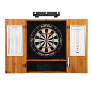 Get your dart game started off right! This comprehensive bundle includes everything you need to make a stylish addition to your game room. Each set includes a premium dartboard cabinet, a sisal dartboard, a set of steel tip starter darts and a Shadowbuster Dartboard Illuminator. The dartboard cabinet is made from solid pine and constructed with box joints and bronze hinges for a classic look. A dry erase scoreboard and out chart come included with the cabinet. The regulation sized dartboard features a rounded galvanized spider, allowing your darts to slide off and into the target area. Made from self-healing sisal fibers, you will surely enjoy your dartboard for years. A Shadowbuster dartboard light gives you crystal clear vision of the board. Included are two sets of starter darts, dry erase scoreboard, out chart board, dry erase marker and mounting hardware.