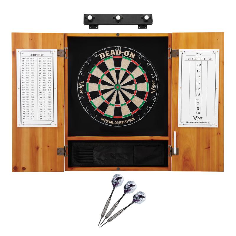 Viper Dead On Sisal Dartboard, Metropolitan Oak Cabinet, Underground The Raven Steel Tip Darts & Shadow Buster Dartboard Lights