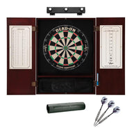 Breathe new life into your darts game with the Viper Dead On Sisal Dartboard, Metropolitan Mahogany Cabinet, Shadow Buster Dartboard Lights & "The Bull Starts Here" Throw Line Marker Bundle! You'll be shooting straight and winning every duel after practicing a few times with this set! The Dead-On is Tournament Quality Regulation 17.75" in diameter and made from compressed sisal fibers, granting it substantial longevity in comparison to older, wood-based boards. This is due to the material's "self-healing" nature: the sisal fibers automatically close the holes left behind by your darts, essentially returning the board to its original state whenever a dart is removed. You can also rotate the detachable number ring around the board, allowing your prime spots to move to a new section when the previous ones wear down. Its staple-free bullseye and galvanized triangular spider wire also significantly decrease your odds of bouncing out upon impact. Easy-to-use mounting hardware lets you play straight out of the box, and if you're not sure where to begin in your journey to darts greatness, a handy game manual is included to steer you in the right direction. Meanwhile, the Metropolitan Cabinet containing the board is constructed from pine and held together via box joints; its back is reinforced with thick black cloth to protect your wall from punctures. The doors of the cabinet are fitted with self-closing brushed nickel hinges and feature built-in dry erase scoreboards. Darts and other accessories can be stored in the compartment below the board area. The Shadow Buster illuminates your dartboard from above, making it - and all of your targets - visible in any rec room at any time. It also flips up when not in use and runs on four AA batteries. Rounding out the bundle is a standard throw line marker that's easily applied to any floor.