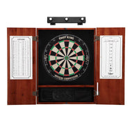 Get your dart game started off right! This comprehensive bundle includes everything you need to make a stylish addition to your game room. Each set includes a premium dartboard cabinet, a sisal dartboard, a set of steel tip starter darts and a Shadowbuster Dartboard Illuminator. The dartboard cabinet is made from solid pine and constructed with box joints and bronze hinges for a classic look. A dry erase scoreboard and out chart come included with the cabinet. The regulation sized dartboard features a rounded galvanized spider, allowing your darts to slide off and into the target area. Made from self-healing sisal fibers, you will surely enjoy your dartboard for years. A Shadowbuster dartboard light gives you crystal clear vision of the board. Included are two sets of starter darts, dry erase scoreboard, out chart board, dry erase marker and mounting hardware.