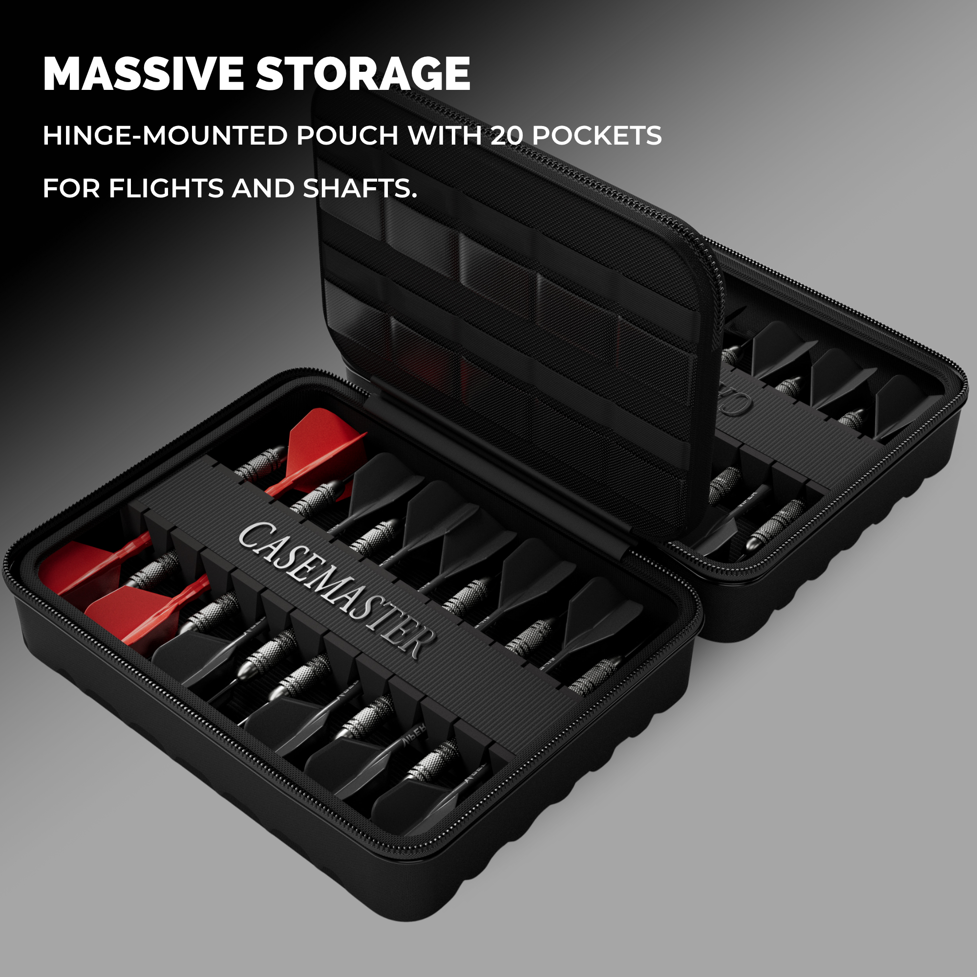 - Massive Storage – Hinge-mounted pouch with 20 pockets for flights and shafts, plus two removable zippered cases.