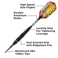 - Includes six flights, three extra nylon replacement shafts, thirteen 2BA Tufflex II Tips, Dart mechanic repair tool, accessory bag and aluminum case.