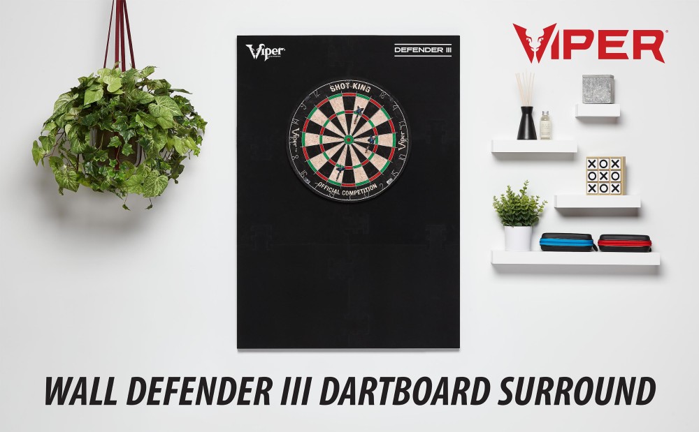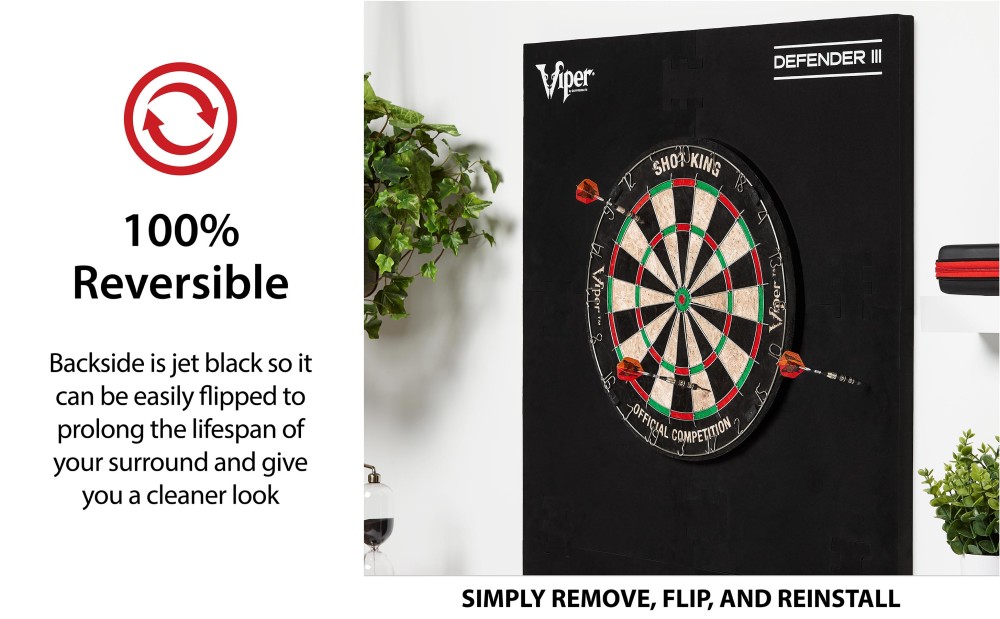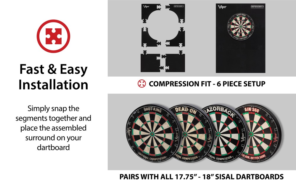 The Viper Defender III Dartboard surround is the easiest way to get maximum coverage on your wall. The EVA Foam is 1” thick so you don’t need to worry about darts penetrating through, but it’s also light enough to easily hang on your wall without any extra support. Installation is incredibly easy, simply snap the segments together and place it onto your dartboard for 8.2 square feet of protection. To make things easy, this surround is compatible with both 18” and 17.75” regulation sisal dart boards. The included adhesive compression band can be used to ensure a tight fit on either sized dartboard so you don’t need to worry about darts sliding by. Dartboard and darts are sold separately.